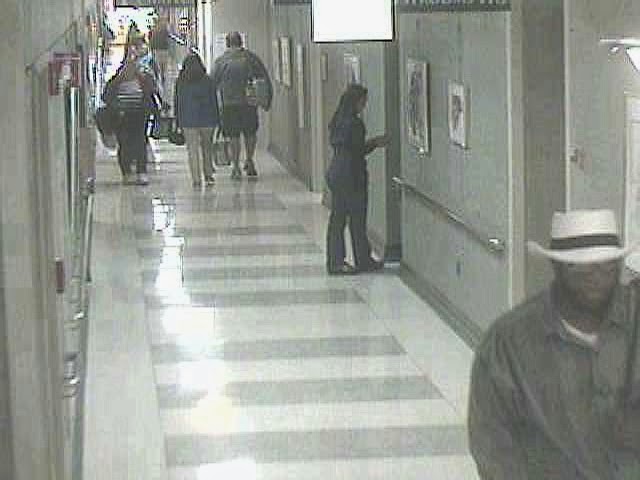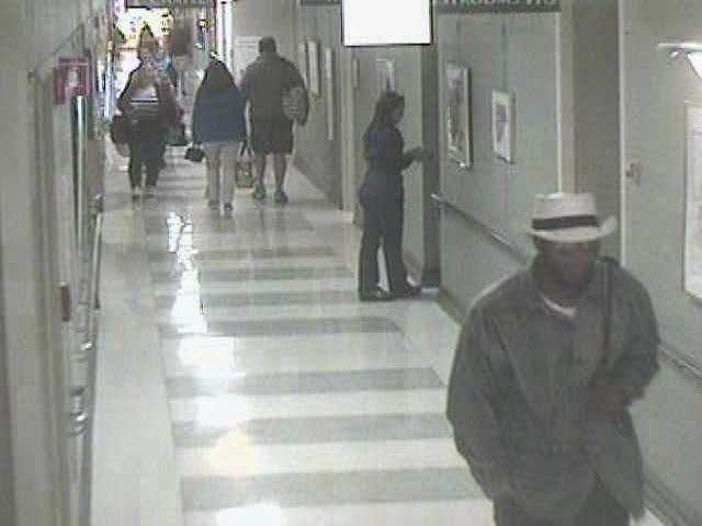 Multiple surveillance cameras captured the suspect around the time of this incident. He is described as a dark skinned male between 5'10 and 6'1, who was wearing a white panama jack style hat, large sunglasses, a gray long sleeve shirt, blue jeans and black shoes at the time of the incident.