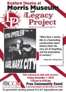 Free and open to the public, Karl Marx City, followed by a Q&A with Epperlein, will be shown at the Morris Museum Bickford Theatre, on Friday, Nov. 1, from 7:30 to 9:30 p.m. To guarantee seating, please RSVP to leagacy@ccm.edu.