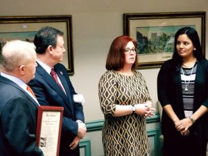 Among those accepting the resolution were CCM President Anthony Iacono, CCM graphic design instructor and The Promethian advisor Kathy McNeil, and three members of the student design team, Marshall Williams of Mount Olive, Yanira Rodriquez of Mount Olive, and Brian Larney, of Livingston. Each of the students also received a county certificate of congratulations.